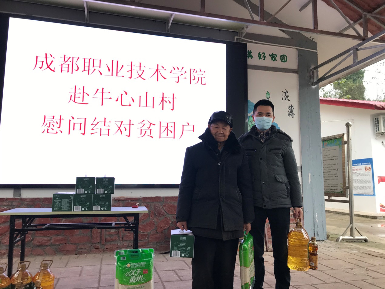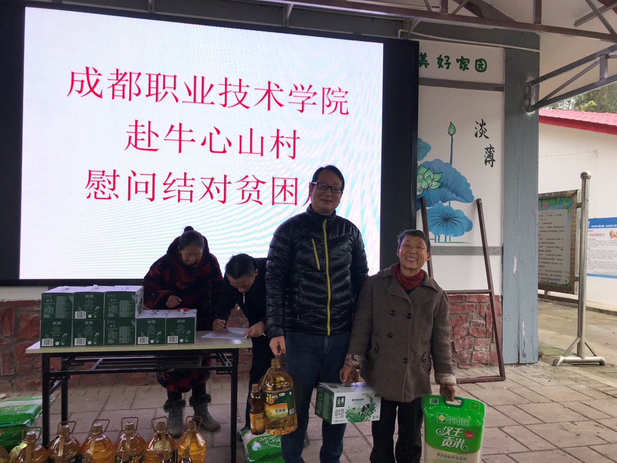 12月9日上午,医护学院党支部书记何涛,国际教育学院院长李晓莉、国际交流合作办公室主任钟富强,软件学院党总支副书记刘喜和部分党员代表来到学院对口帮扶点简阳市禾丰镇牛心山村,看望当地贫困户,向困难群众送上暖冬物资及扶贫资金。