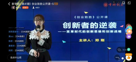 为鼓励青年创新创业,运用变革时代的创新思维和创新战略达到创业致胜的能力,2021年3月9日星期二晚上,部门组织创业部成员自行观看学习由中科创大推出的公益课,名叫《创业致胜》,该课是由浙江大学科技创业中心主任郑刚教授讲授。