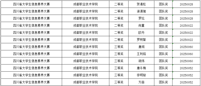 近日,四川省教育厅公布了2025年四川省大学生信息素养大赛项目获奖名单。我校学子凭借扎实的专业功底和出色的实践能力,在激烈角逐中脱颖而出,荣获2项团体二等奖、2项团体三等奖。