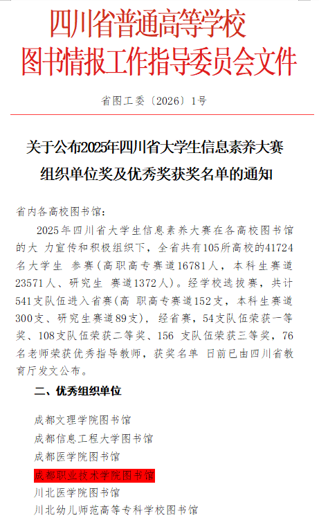 此次大赛紧扣“AI+信息素养”核心主题,吸引全省105所高校、41724名大学生参赛。大赛分设高职高专、本科生、研究生三个赛道,经各校严格选拔,541支队伍晋级省赛。我校图书馆高度重视,积极组织学生备赛,通过校赛选拔、省赛集训的层层筛选,最终取得2项团体二等奖与2项团体三等奖的优异成绩。