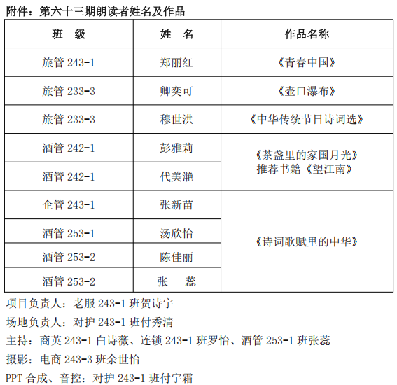 旅管 233-3 班穆世洪围绕《中华传统节日诗词选》,带来“月圆·国圆·人圆——从‘小家’团圆到‘大家’荣耀”的主题分享。中华传统节日诗词是中华文化的瑰宝,字里行间蕴含着深厚的文化底蕴与浓厚的家国情怀,穆世洪同学的分享让这份文化与情感进一步传递。酒管 242-1 班彭雅莉、代美滟 2 位同学精心准备,在袅袅茶香中诵读《茶盏里的家国月光》,还积极推介了茅盾文学奖获奖作品《望江南》。该书以茶文化为纽带,串联起传统节日与家国情怀、文化传承与时代担当,让茶文化走出典籍、走进生活,成为连接传统与现代的桥梁。