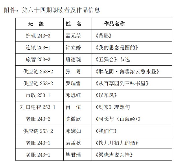 护理 243-3 班孟元堃同学率先登场,带来朱自清先生的经典散文《背影》。他以富有感染力的声线,将文中父亲蹒跚的身影、笨拙却深沉的爱意缓缓道来。那些跨越百年的文字,恰似一封封饱含深情的“亲情信”,唤醒了在场师生对父辈默默付出的感念,也引发了大家对亲情的深刻反思。随后,连锁 253-1 班钟立婷同学分享艾青诗作《我的思念是圆的》。她结合诗人的个人经历,将个人的思亲之情、思乡之愁,与对祖国统一的深切期盼相融,以“月亮”这一经典意象为纽带,让在场听众在秋日的氛围中,感受到个人情感与民族命运同频共振的厚重力量。