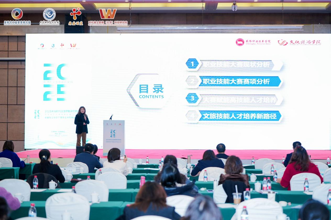 在专题论坛上,黄晓菲副院长以 “赛教融合・创新驱动,职业技能大赛与课堂教学的双向赋值” 为主题,立足数智时代文旅产业转型升级需求,系统拆解了学院以职业技能大赛为纽带的育人体系构建路径。她在专题汇报中指出,面对新质生产力发展对文旅技能人才的复合型、创新型要求,学院打破 “赛事与教学两张皮” 的传统模式,构建了 “以赛促教、以赛促学、以赛促改、以赛促建” 的良性循环机制。