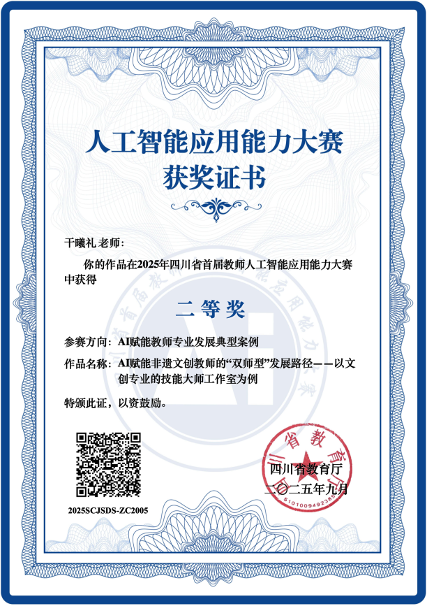 2025年四川省首届教师人工智能应用能力大赛结果近日揭晓,文化旅游学院(成都非遗学院)文创专业干曦礼老师的作品《AI赋能非遗文创教师的“双师型”发展路径——以文创专业技能大师工作室为例》,在高职组“AI赋能教师专业发展典型案例”评选中荣获二等奖。