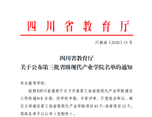 2026年1月16日,四川省教育厅发布了《关于公布第三批省级现代产业学院名单的通知》,我校联合中兴通讯股份有限公司、北京火山引擎科技有限公司、阿里云飞天(杭州)云计算技术有限公司、四川讯方信息技术有限公司共同申报的“新一代信息技术信创产业学院”成功立项建设。