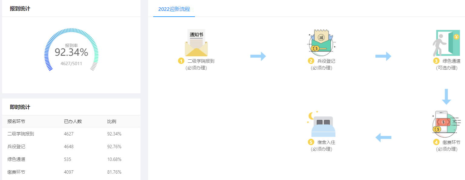 2022年9月13日至14日,各二级学院按照《通知》要求,组织辅导员与学校招生就业处、财务处、党委武装部(保卫处)、信息中心、后勤国资处等部门通力合作,利用迎新系统,顺利完成2022年秋季学期新生网上报到注册工作。