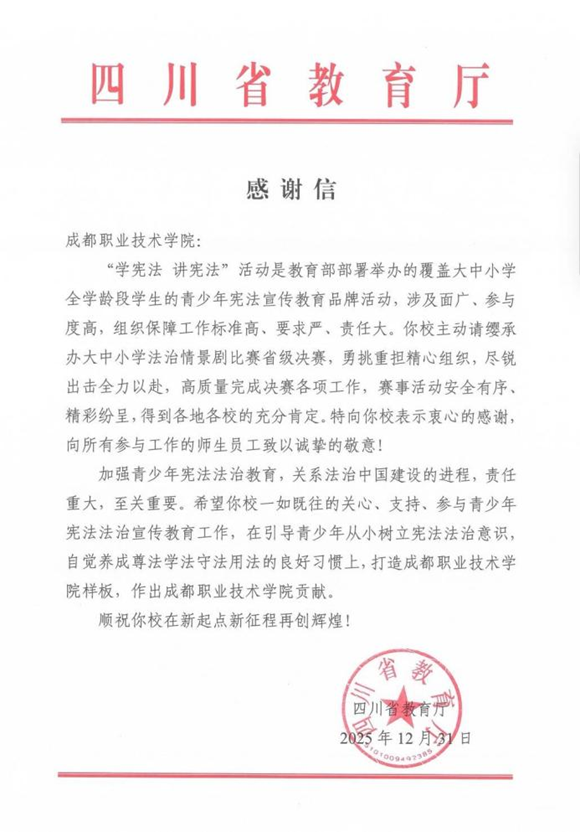 省教育厅的感谢信既是对我校办赛能力的认可,更是对我校长期以来坚持法治育人、服务社会的高度评价。学校将以此次承办活动为契机,进一步总结经验、拓展形式,持续深化法治教育模式创新,充分发挥职业院校在实践育人方面的特色优势,努力在青少年法治意识培育和行为养成方面打造具有示范意义的“成职样板”,为法治四川、法治中国建设贡献更多教育力量。