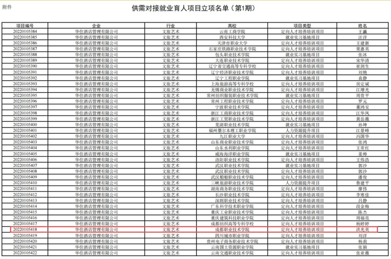 2022年4月2日,教育部高校学生司发布了《关于公布第一期供需对接就业育人项目立项名单的通知》,我院酒店管理与数字化运营专业与华住酒店管理有限公司联合立项第一期供需对接就业育人“定向人才培养培训”项目。