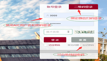 【注:登录账号是教工号或学号,与AIC密码不同,如果提示密码错误,请直接点击忘记密码重置。】