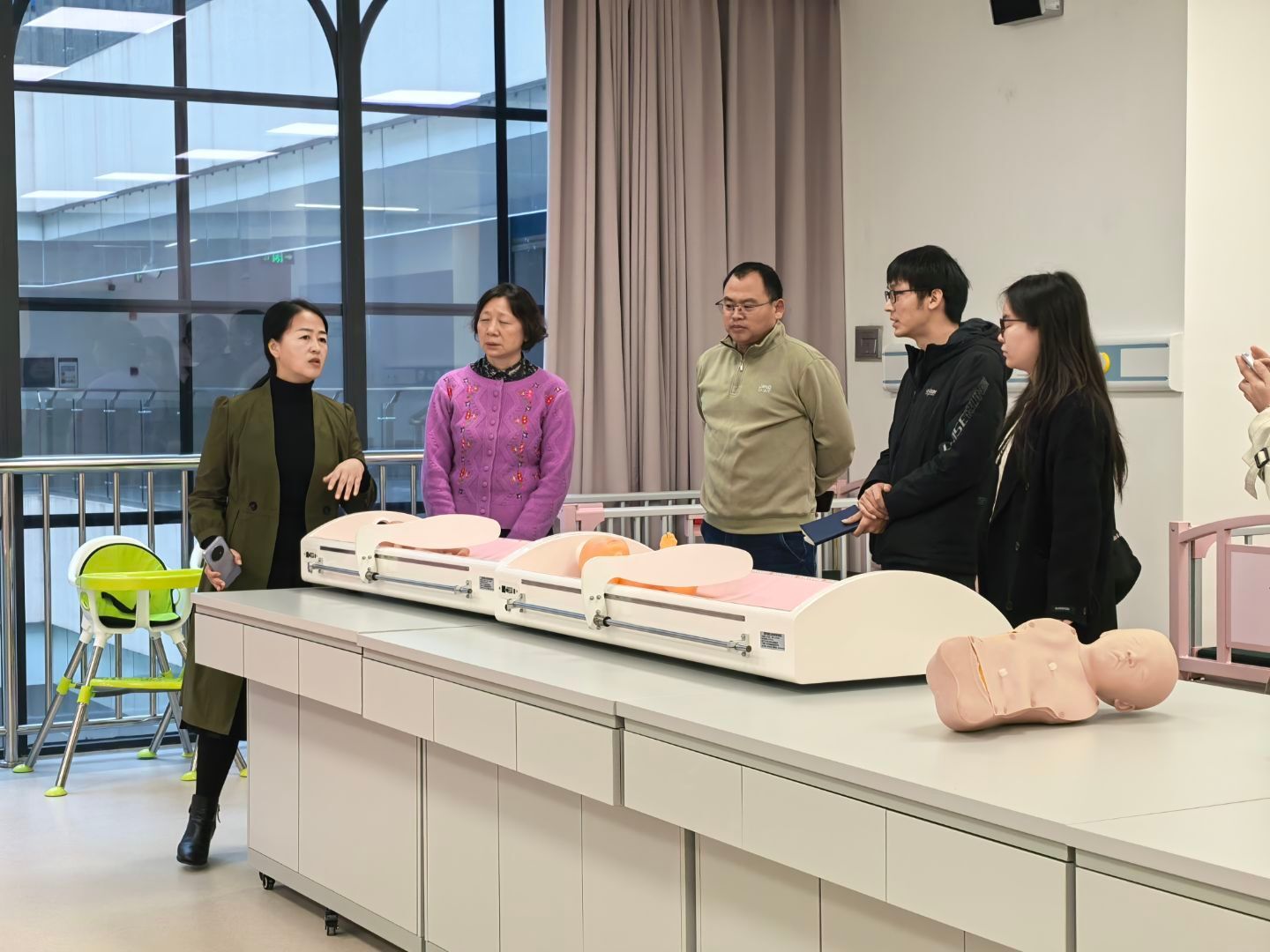 在医护学院相关负责人的陪同下,彭时敏书记一行实地参观考察了医护学院智慧康养实训中心。来访嘉宾细致查看了各类实训室的功能分区、设备配置与运行状态,并就实训教学的组织实施、设备维护管理、环境文化建设等具体问题与我院陪同人员进行了现场交流。