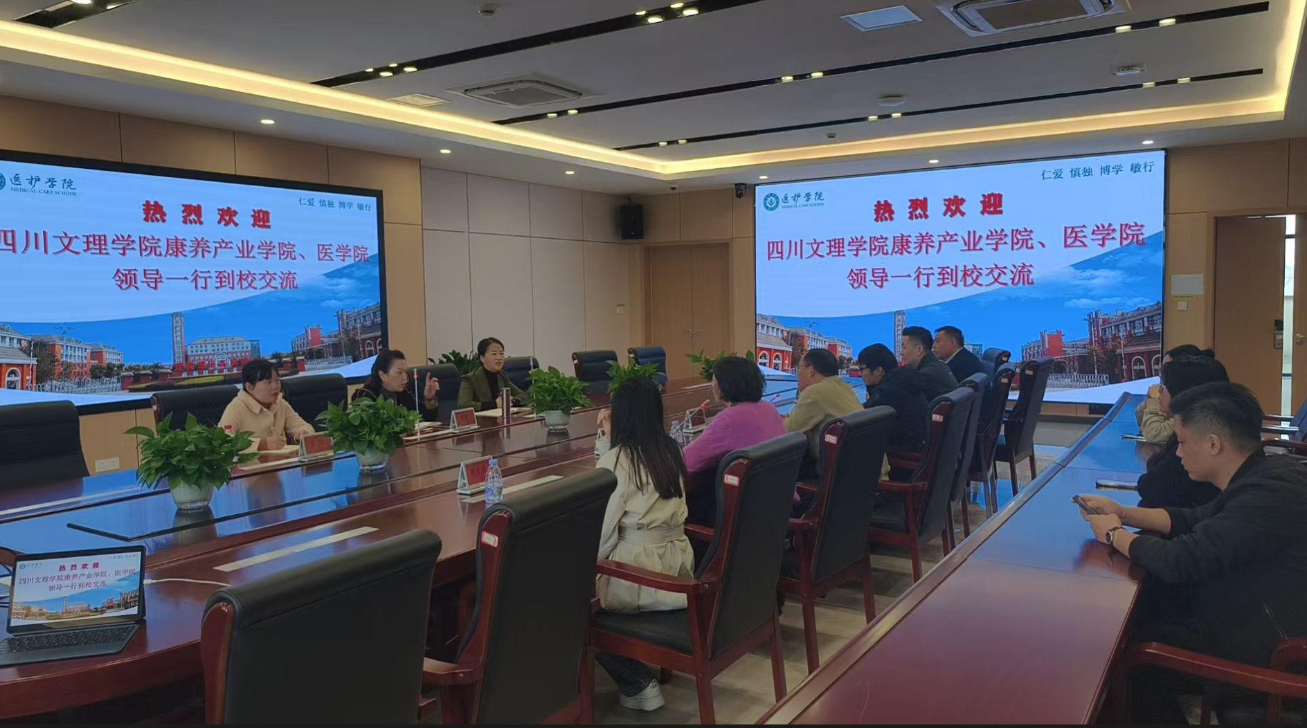 随后,双方围绕康养产业、医养结合等的核心议题展开了广泛而深入的交流。讨论内容涵盖实训室建设的标准与前瞻性规划、课程内容的优化与创新、基于岗位能力需求的人才培养模式改革,以及职业教育与普通教育融通发展的可行路径与协作机制。四川文理学院康养产业学院、医学院方面也分享了其在康养领域和医学教育中的特色与探索。据悉,四川文理学院康养产业学院、医学院是该校为积极响应“健康中国”战略,服务区域康养产业发展需求而设立的重要教学科研单位,聚焦于培养兼具医学背景与康养管理能力的复合型人才,在相关领域形成了自身的办学特色。