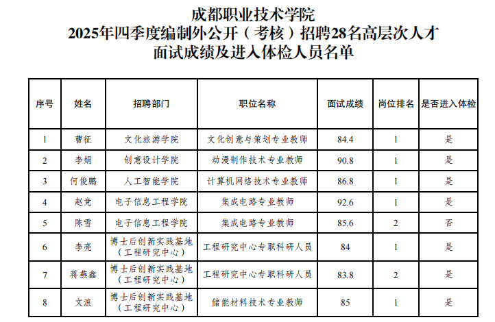 根据《成都职业技术学院2025年四季度编制外公开(考核)招聘28名高层次人才公告》要求,现将面试成绩及进入体检人员名单公告如下。